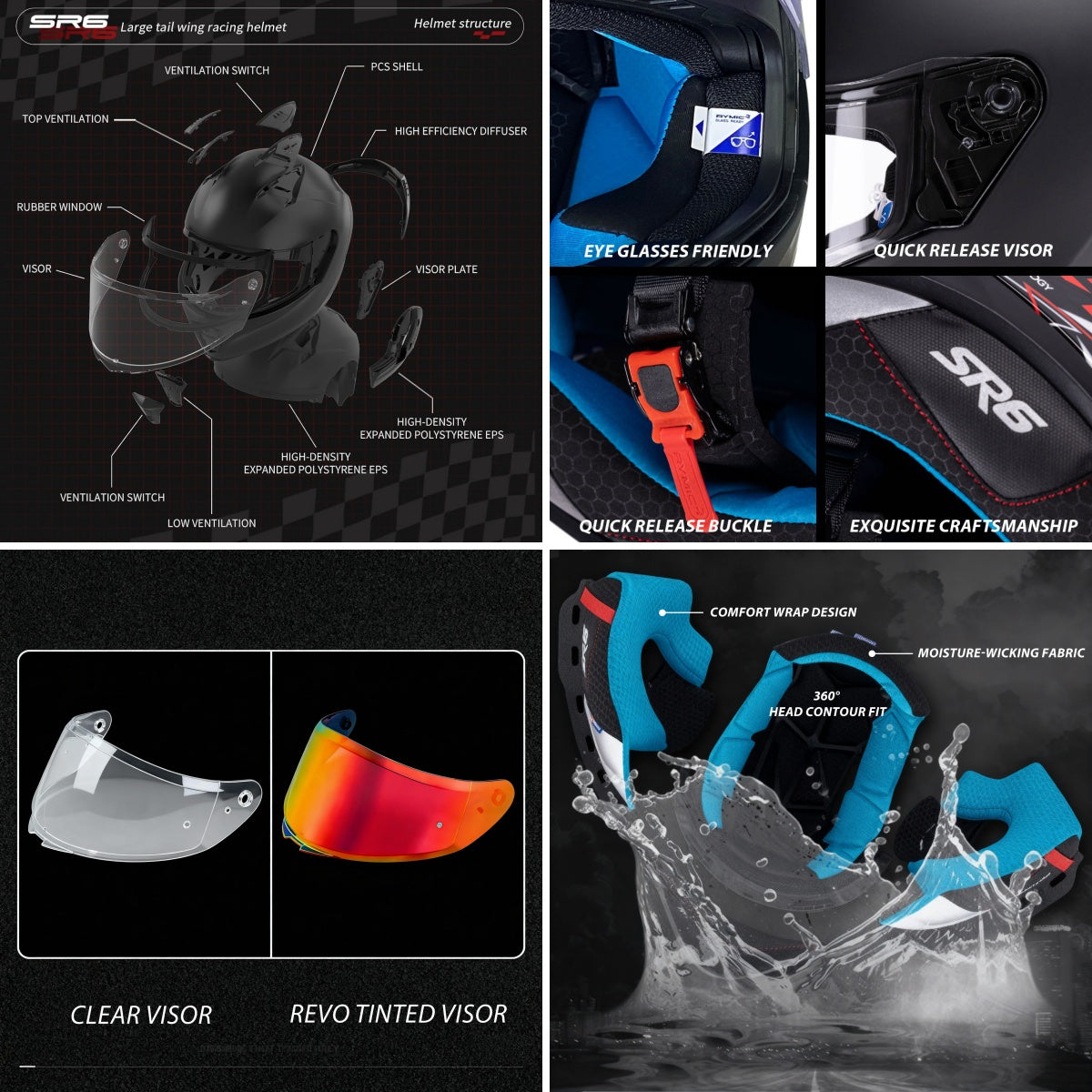 The SR6’s ventilation system is tailored for daily use: a chin vent, top intakes, and rear exhaust circulate air to prevent overheating during commutes. Visibility is a standout with 190° Max Vision (wide field of view for spotting obstacles) and two included visors: a clear, scratch-resistant one for low-light/rainy days and a REVO tinted visor for sunny conditions. Swapping visors is quick and easy—adapt to changing weather in minutes.
